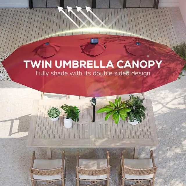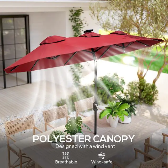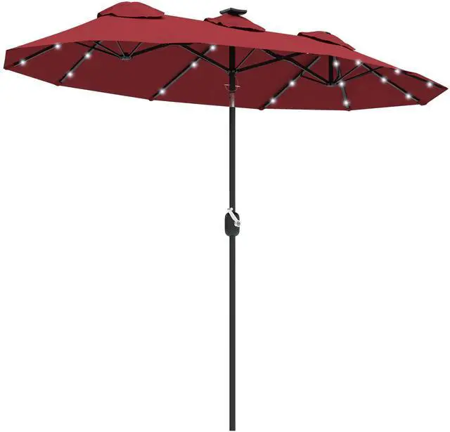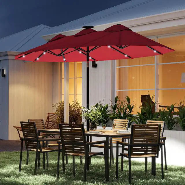 Like to read in the great outdoors? Enjoy picnics out in the summer breeze? Have a long dining table for an umbrella, but no umbrella fits? Say goodbye to sunburns this summer with Aosom. This large outdoor umbrella features 36 lights on the frame ribs to light up your outdoor seating when dark. Use its tilting top to get rid of glare from anywhere. It's a large patio umbrella with outdoor-ready polyester and a robust steel frame to provide soothing shade throughout the summer.