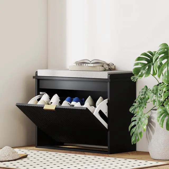 - - Compact shoe storage bench saves entryway space