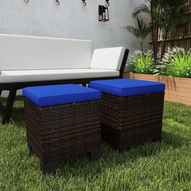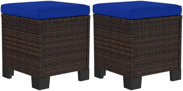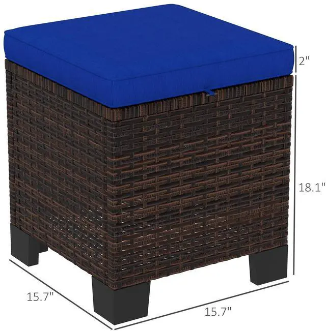 • Aosom 2 Piece Wicker Outdoor Ottomans with Cushions, Rattan Ottoman Footrest and Side Table for Patio, Yard, Poolside, Dark Blue