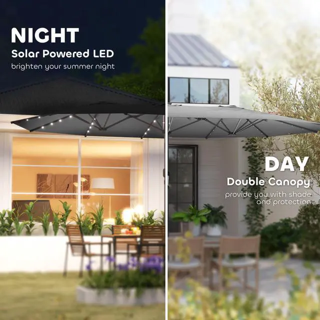 It's time for your garden to shine with this double-sided parasol from Aosom. A stylish design, the market parasol features 48 lights on the frame ribs to light up your outdoor seating when dark. The garden double parasol creates plenty of shade, protecting you from direct sunlight. Using a crank mechanism for effortless opening and closing. This LED lighted garden parasol is a great go-to item for you and your family and friends to relax in the summer.
