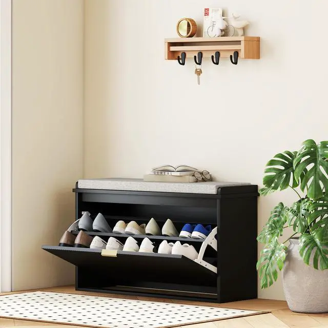 - - Compact shoe storage bench saves entryway space
