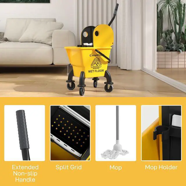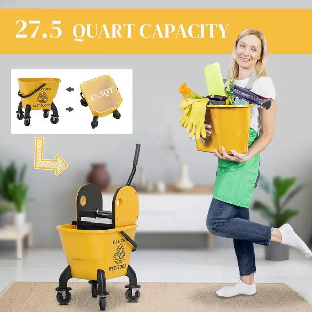 Make cleanup a breeze with the Aosom mop bucket for floor cleaning! This yellow mop bucket boasts a 27.5-quart capacity, and a down press wringer ensures efficient mopping with less strain. Glide effortlessly across floors with its four smooth wheels and enjoy the comfort of its ergonomic handle and high back. It has a handy mop holder and a mop to get you started!