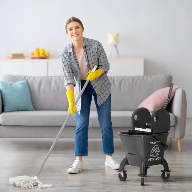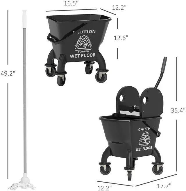 Make cleanup a breeze with the Aosom mop bucket for floor cleaning! This black mop bucket boasts a 27.5-quart capacity, and a down press wringer ensures efficient mopping with less strain. Glide effortlessly across floors with its four smooth wheels and enjoy the comfort of its ergonomic handle and high back. It has a handy mop holder and a mop to get you started!