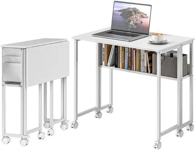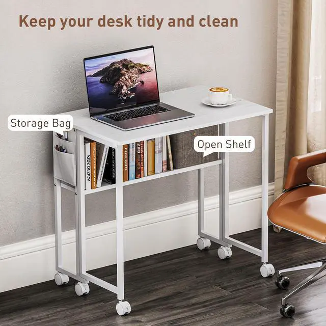 Maximize your space with the Aosom small computer desk, a space-saver that transforms from a 19.7" deep office desk to a slim 8.3" side table with its foldable drop-leaf design. Stay organized with a convenient open storage shelf and a handy side storage bag. Wheel the study desk anywhere with ease, thanks to six 360° swivel casters, four of which lock for stability. Great for home offices, study areas, or compact living spaces.