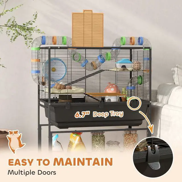 Discover a vibrant world for your small pet with the Aosom big hamster cage. This 3-tier pet rat cage is a colorful playground featuring large Dia. 2.8" tunnels, a cozy hut, and a Dia. 7.5" exercise wheel, tailored for Syrian hamsters and gerbils. A deep 6.7" tray allows for lots of bedding, enhancing play. Easy access via front and top doors makes maintenance a breeze!