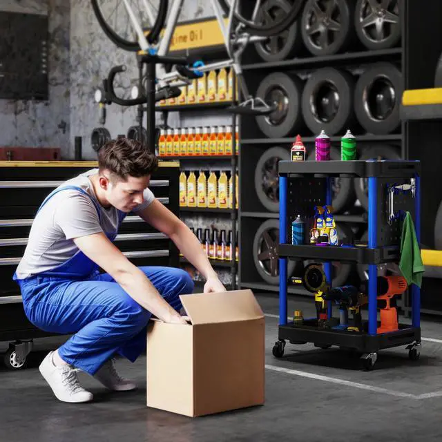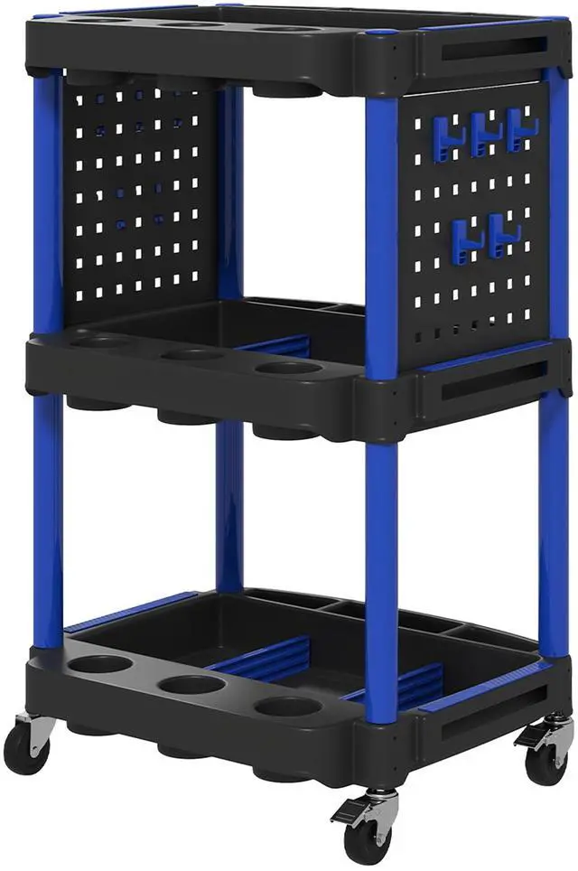 Transform your workspace with the Aosom utility cart. Glide effortlessly with four universal wheels, two of which can be securely locked in place with brakes while working. Maximize your organization with three-tier shelves, side-hole shelves, and ten hooks. Suitable for garages, workshops, and warehouses, this rolling tool cart keeps tools tidy and accessible, making every project a smoother, more well-organized experience.