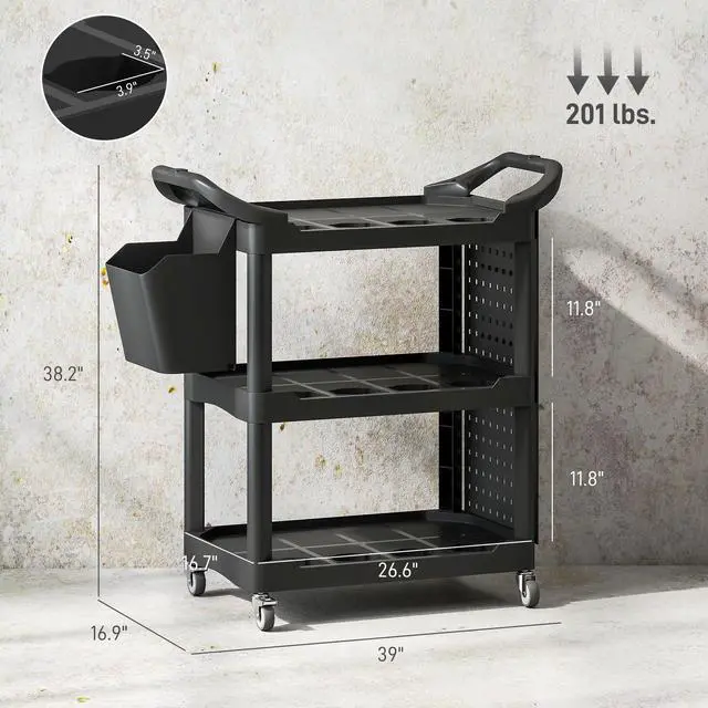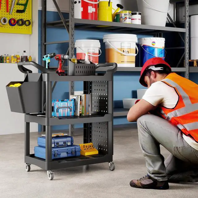 Unleash the power of organization with the Aosom utility cart! This versatile tool cart is designed to keep your garage or workshop neat and tidy. It features three-tier shelves, a side-hole shelf with ten hooks for hanging tools, and a handy storage bucket. With side handles and wheels with brakes, this rolling cart can be positioned wherever you need it to optimize your workspace.