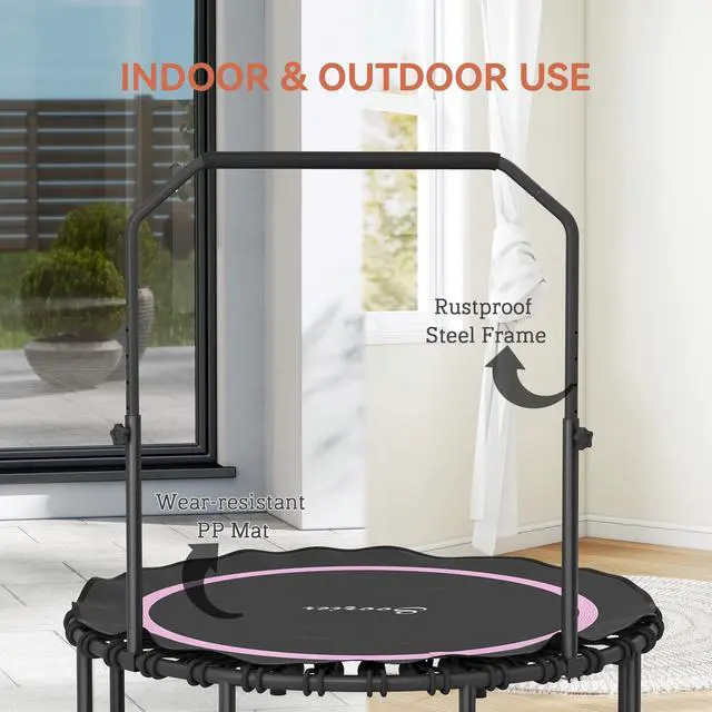 Stay active at home with the Soozier rebounder trampoline for adults and teens. This exercise trampoline features 36 bungee cords and a 5-level adjustable handle for a smooth, quiet bounce that protects joints for added safety. The rust-resistant steel frame and PP mat provide indoor and outdoor durability. This workout trampoline for adults is foldable to 25% of its full size for easy storage. Quick setup in minutes lets you quickly start your cardio, balance, and strength training exercise.