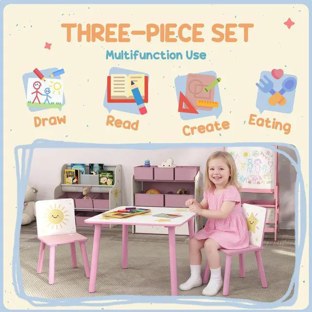 Brighten your child's day with this cute Qaba 3-piece table and chair set! Designed for kids 3+, it's excellent for drawing, reading, or playtime fun. The pink finish with star patterns adds charm, while rounded edges and a kid-sized height offer safe, comfy use. Light and easy to move, it is suitable for any playroom or bedroom. Let little imaginations shine every day!