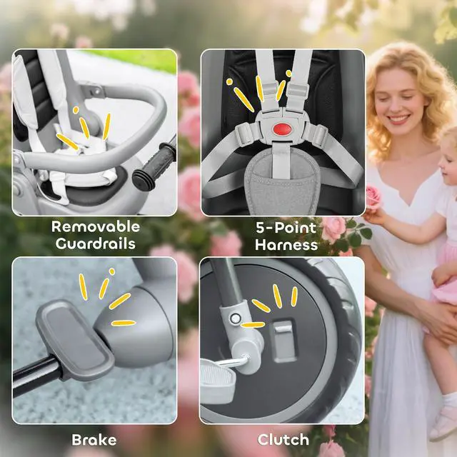 - - Five-point harness and removable guardrail keep your child secure