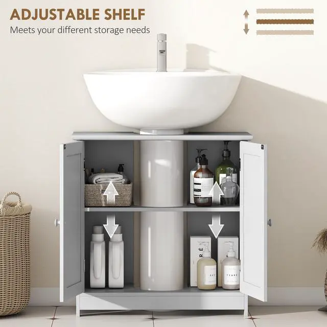 - - An adjustable shelf to store bathroom essentials or cleaning products in a convenient place