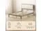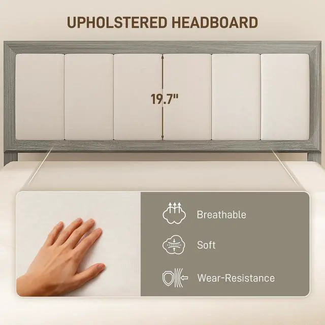Enhance your bedroom with the Aosom queen size bed frame, featuring a chic beige linen-look fabric upholstered headboard and a stylish wood grain frame. This elegant platform bed offers plenty of under-bed space for storage and easy cleaning by automated robots. Its robust structure supports up to 726 lbs., providing great stability for a restful sleep.