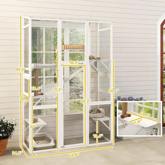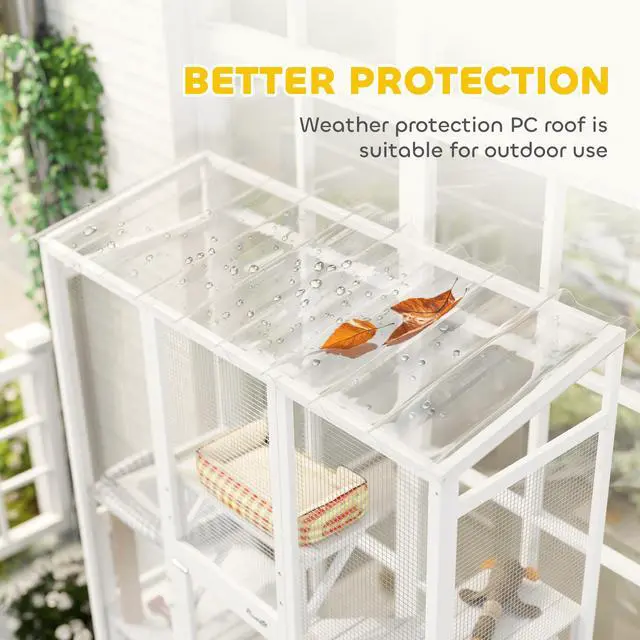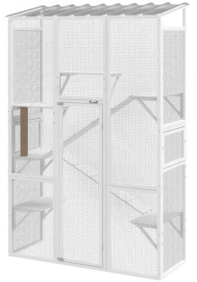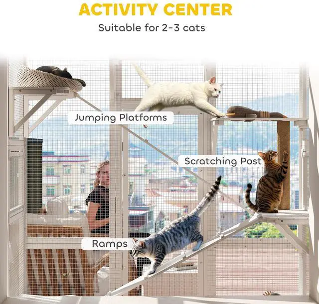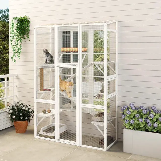 Transform your feline's life with the Aosom large catio! This outdoor cat enclosure expands their world, safely connecting them with nature. Equipped with a protective safety net, it shields your cats from hazards while providing a spacious play area with six jumping platforms and two ramps. It is suitable for 2-3 cats to explore and lounge in their own cat patio.