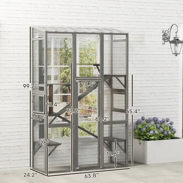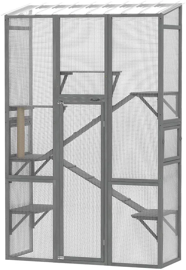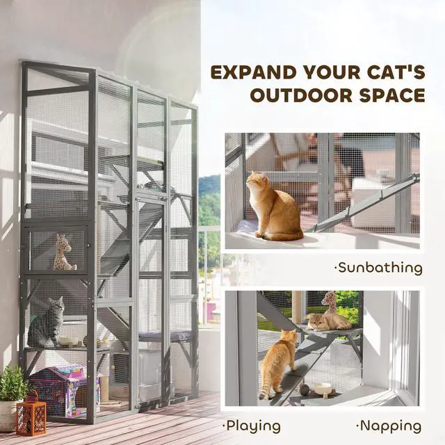 Transform your feline's life with the Aosom large catio! This outdoor cat enclosure expands their world, safely connecting them with nature. Equipped with a protective safety net, it shields your cats from hazards while providing a spacious play area with six jumping platforms and two ramps. It is suitable for 2-3 cats to explore and lounge in their own cat patio.