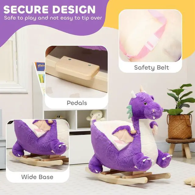 The Qaba toddler dragon rocking horse transforms playtime into a carefree, exhilarating adventure. It captivates your child with precious playtime moments while keeping them secure, freeing you from worry. The enchanting purple dragon design of this kid's rocking horse and exciting dragon sounds spark imagination, while the plush, cozy seat, stable base, and three-point safety belt provide a secure ride for your child that offers you peace of mind in the process.