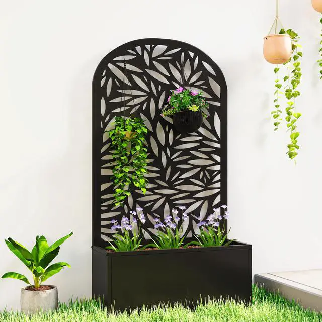 Transform your outdoor space with the Aosom metal planter, featuring a curved privacy panel with large leaf cut-out motif. This metal garden planter boasts a spacious 22.8" L x 8.3" W x 9.4" H interior, great for nurturing plants in up to 7.7 gallons of soil. Its versatile design allows for wall mounting or freestanding setups, making it a charming addition to any garden.