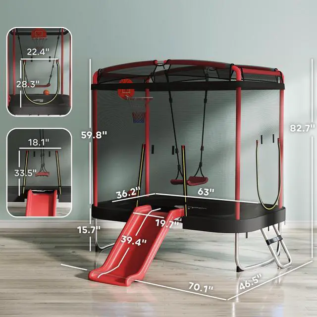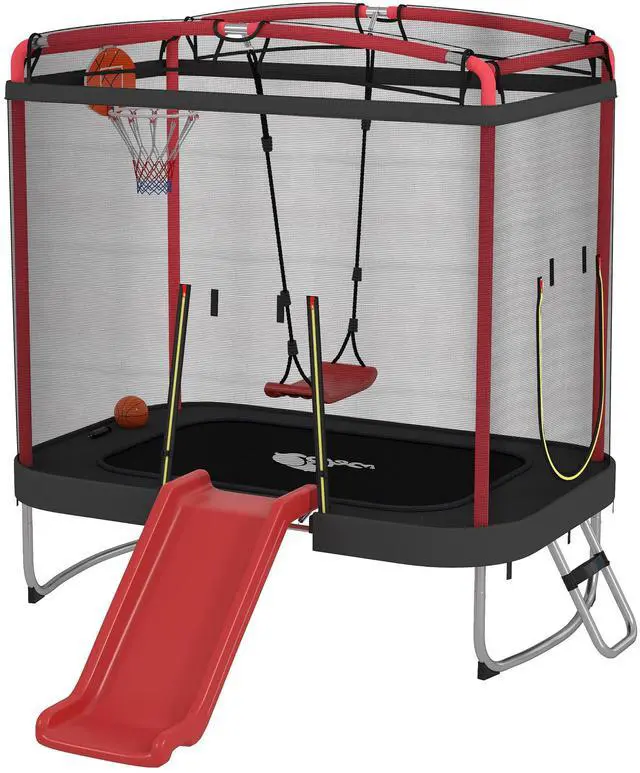 This Qaba trampoline for kids transforms your yard into a safe outdoor adventure zone, making it a reliable alternative to indoor screen-based activities or less-versatile outdoor play equipment. This robust toddler trampoline, with its 59.8" high net and padded springs, offers peace of mind during playtime. More than just for bouncing, it features a slide, swing, and hoop, providing endless fun and active, cherished family memories.