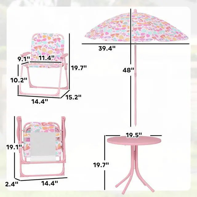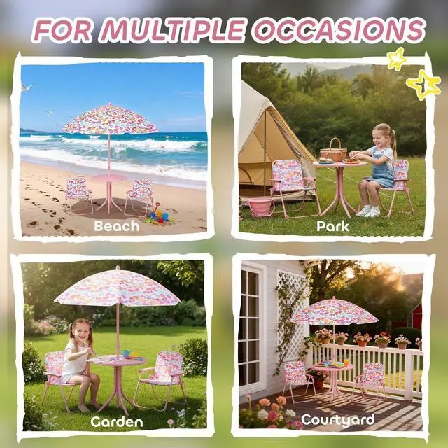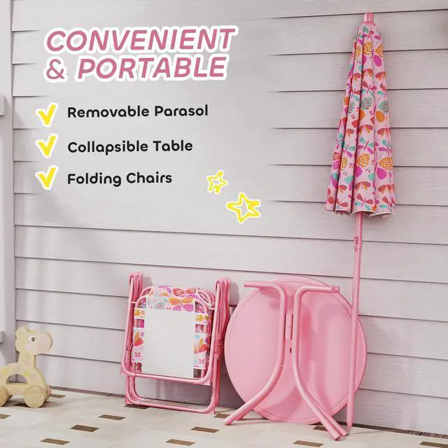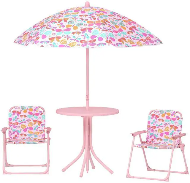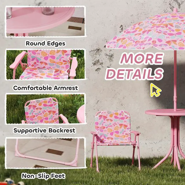 Transform your garden into a whimsical playground with a Qaba patio table and chairs with umbrella, featuring a cute butterfly design. This four-piece set includes two kids' patio chairs and a toddler picnic table with a central hole for the adjustable umbrella, offering shade on sunny days. Suitable for children aged 2-5, the entire set easily folds away for convenient storage.