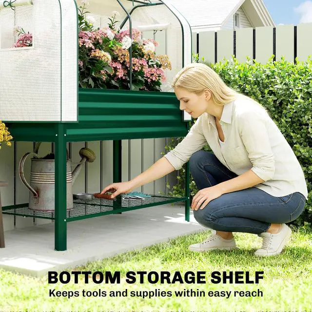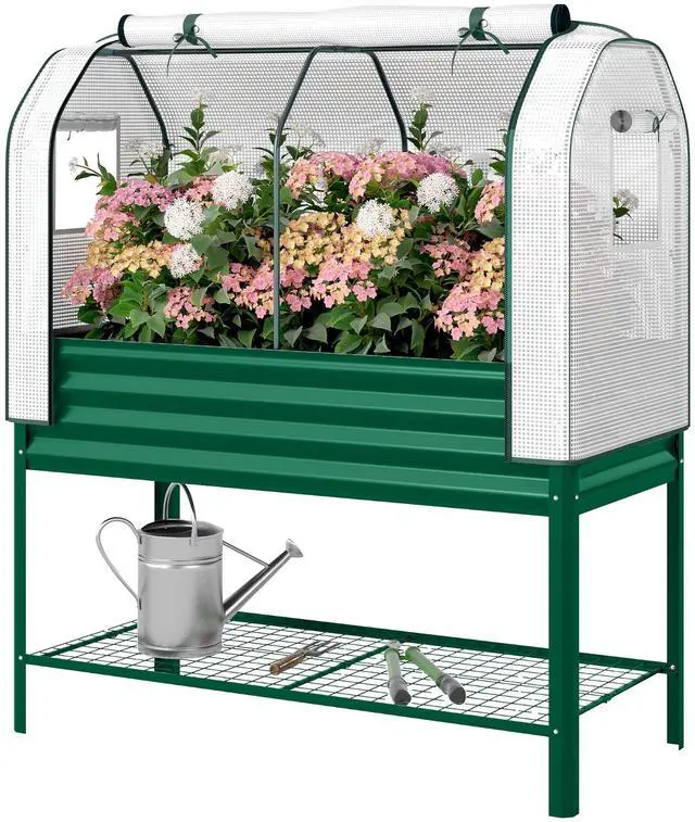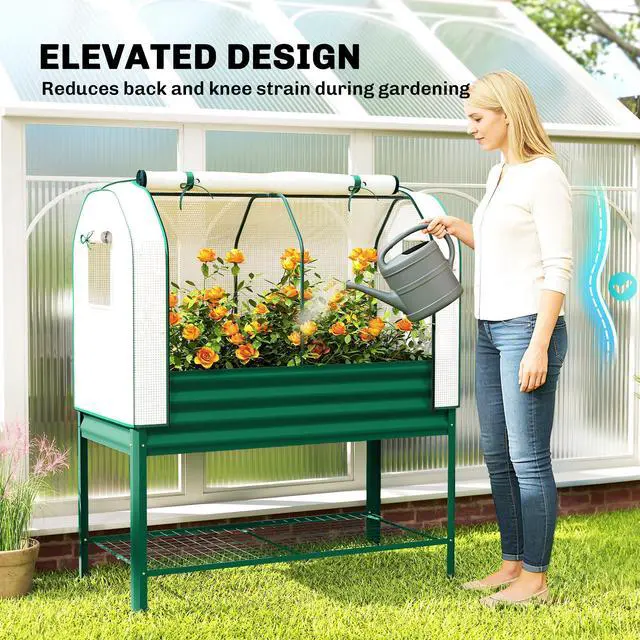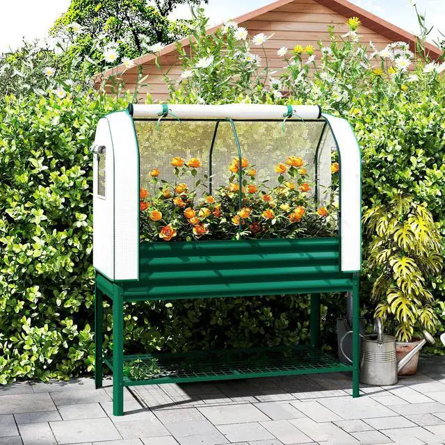 Transform your gardening experience with the Aosom raised planter box. The PE greenhouse cover with roll-up zipper door and side vents protects plants from frost and wind while letting in sunlight and maintaining airflow. The garden planter reduces bending and strain on your back and knees and the bottom mesh shelf keeps tools and supplies within reach for easy, efficient gardening, making plant care more organized and enjoyable year-round.