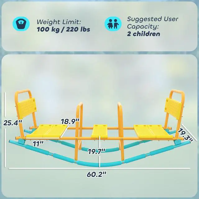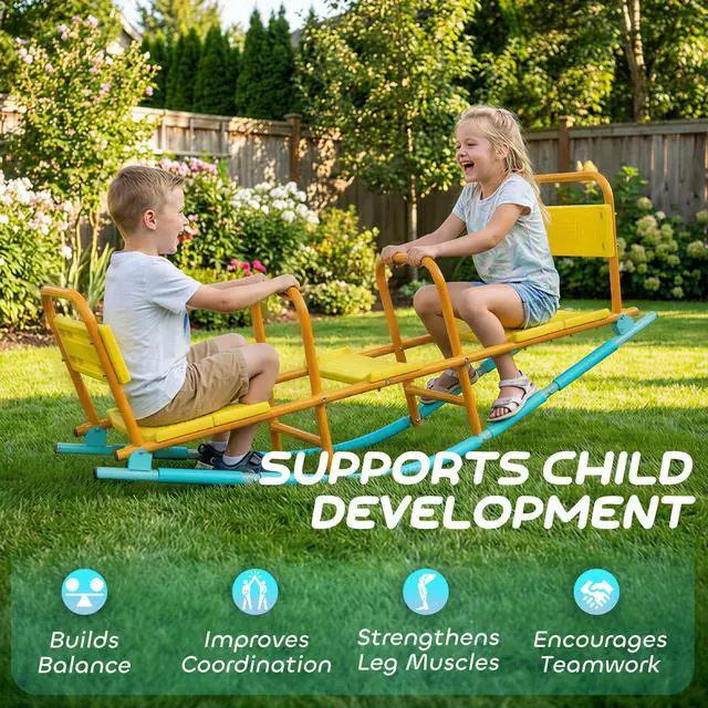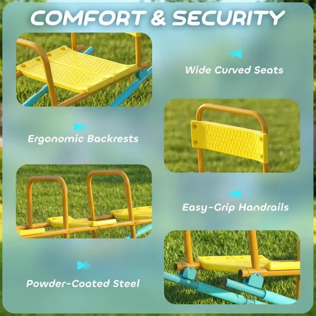 Tired of flimsy seesaws that cut playtime short and cause safety worries? Watch your children's faces light up as the Qaba teeter totter combines classic up-and-down fun with a smooth rocking motion. Its robust steel frame provides stability, while extra-wide seats with backrests provide comfort. This dual-motion kids teeter totter offers peace of mind and endless giggles, creating cherished memories in your own backyard.