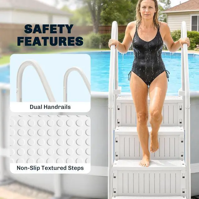 Does the thought of an ill-fitting or wobbly pool entrance spoil your summer relaxation? Imagine the constant worry about slips or instability, especially with family around. The Aosom above ground pool steps offers a secure solution. Its height adjusts from 46.1" to 57.9" for a precise fit while dual handrails and non-slip steps provide safety. This versatile above ground pool ladder ensures peace of mind for every dip.