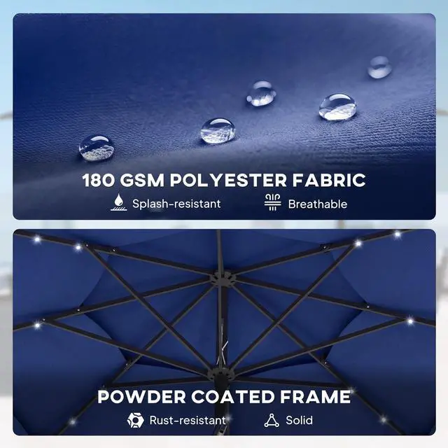 Relax outdoors in effortless comfort with the Aosom 9.7 ft patio umbrella, made to carry you from bright afternoons into calm, glowing evenings. As the sun goes down, solar-powered LED lights softly illuminate the canopy, creating a welcoming atmosphere. The three-tier vented design encourages airflow for a cooler feel. Finished with a smooth hand crank and easy tilt function, this umbrella makes everyday shade feel simple and inviting.