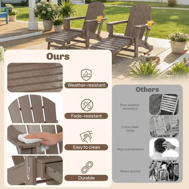 Turn your patio into a place to truly unwind with Aosom Adirondack chairs, designed with pull-out footrests for laid-back lounging. The 105° reclined backrests support your body naturally, helping relieve pressure on the spine and waist. Crafted from all-weather HDPE, they resist fading, cracking, and rot with no painting requiredâjust an easy wipe clean. Ideal for garden gatherings or quiet poolside moments, this design delivers comfort, and everyday practicality in one inviting solution.