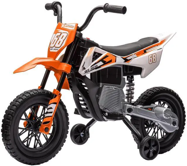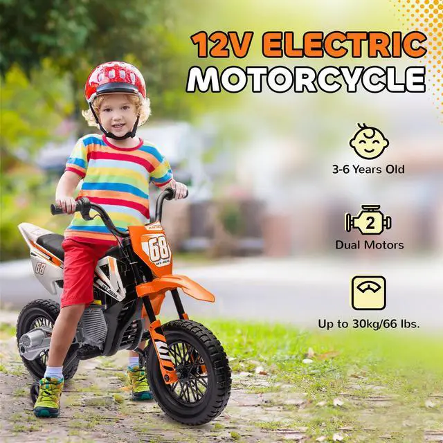 Rev up the fun with the Qaba kid's motorcycle bike. Featuring manual throttle control for speeds between 1.5-3.1 mph and powerful dual 12V motors, this electric motorcycle for kids offers a thrilling ride. Kids can enjoy built-in music and a power indicator for an immersive experience, complete with training wheels to keep the little riders balanced and safe across any adventure.