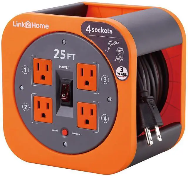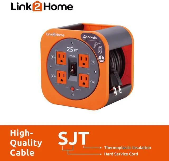 Link2Home 25 ft. Extension Cord Reel with (4) Power Outlets – 16 AWG SJT Cable