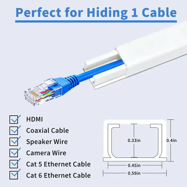 Easily tidy up your single cable:6 pack (W0.7”× H0.4”), each section is 13.2in length, total 80in. Our cord hider is designed for concealing a low-voltage wire or cable such as a power cord, one Cat5 cable, one speaker wire, or one lamp cord, which makes it a great cord hider to maintain a minimalistic look in your home