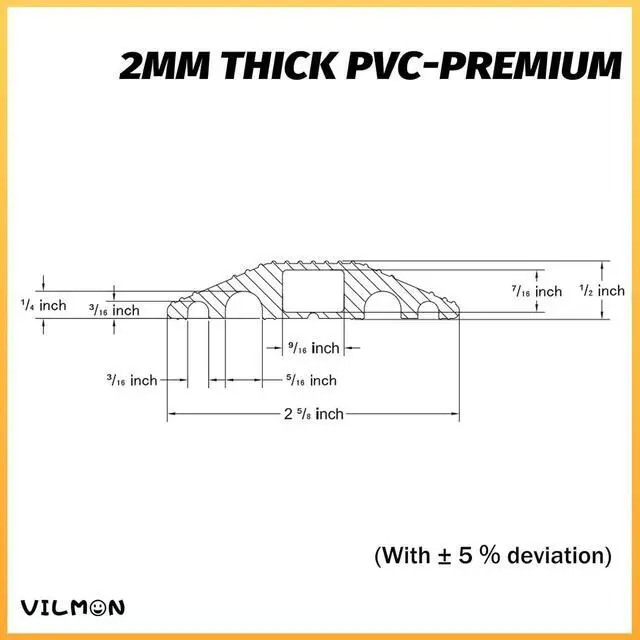 5 Channel Design: Middle Channel Size= 0.53 " (W) x 0.38 " (H). This floor cable cover is designed with 5 holes, the large hole in the middle is 0.53 * 0.38 inches, and the 4 small holes on both sides have a radius of 0.4 in and 0.17 in, which can accommodate smaller-sized wires such as data cables.