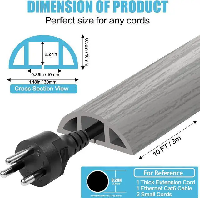 Dimensions: 10 ft length, 1.18 " (W) x 0.4 " (H); internal channel: 0.39 " (W) x 0.27 " (H). This cord hider is designed to conceal one power strip extension cable (up to 0.27 " diameter), or 1 Ethernet cable, speaker cable, or similar cables.