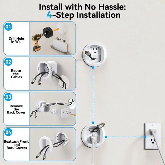 Install like a pro in just 30 minutes! Includes a drywall hole saw drill attachment and dust bag that captures every scrap no messy cleanup! Simply follow our step-by-step guide (drill required). Secure locking wings keep cable modules firmly in place. Transform your space during a coffee break zero hassle!