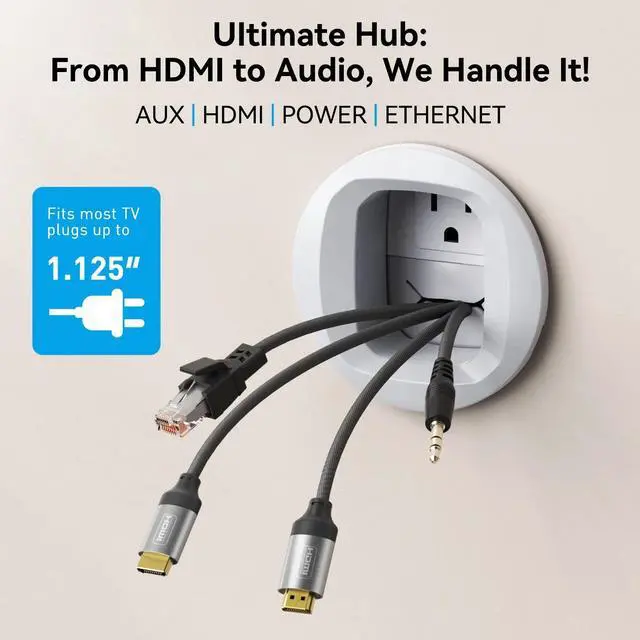 Hide thick HDMI, Ethernet, power cords & audio cables (AUX) easily! Fits up to 4 large braided HDMI cables + extras. Modules handle plugs up to 1.125 inches compatible with most TVs, soundbars, and gaming consoles. Keep PS5, Apple TV, and speakers connected but invisible!