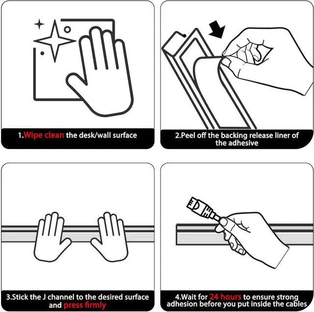 Installation is straightforward: choose a spot, peel off the film, and press the J channel pc cable management firmly onto the desired location. Let the J channel desk cable organizer set for 24 hours for a strong bond. Note that powder walls or uneven surfaces may hinder tape adhesion