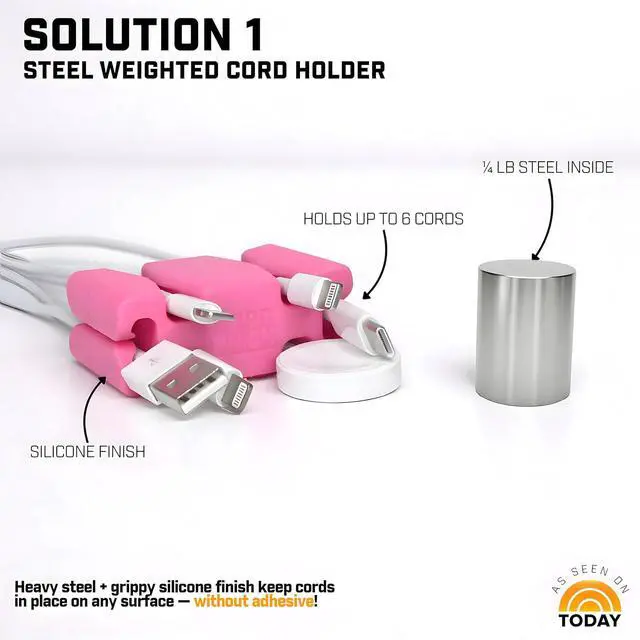 NEVER DROP CORDS: Keep cords secure with our weighted cord holder, designed for cable management on your nightstand cord holder setup, desk, or counter. A steel core adds heft, while grippy silicone makes for a cord clip to ensure cords stay put, making it a must-have desk accessory.