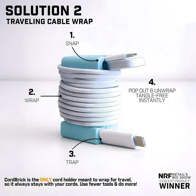 SIMPLE WRAP & UNWRAP: Snap, wrap, and trap cords with our cord organizer, then unwrap instantly for tangle-free use. Perfect as a usb cord organizer for daily desk organization or travel, CordBrick simplifies cable organizer clips needs with one versatile tool.