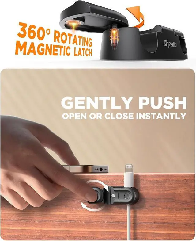 Secure & Swift Magnetic LockingEffortlessly manage desktop chaos with our magnetic cord organizer. The innovative magnetic lid snaps shut, locking cords safely within the cord holder. Even accidental tugs won' t dislodge cables, preventing falls and tangles. Features a 360°rotating latch, allowing access in tight spaces like behind nightstands (perfect nightstand organizer) or desks. Open or close instantly, single-handed, with just a gentle push true 1-second convenience for fast-paced home or office settings.