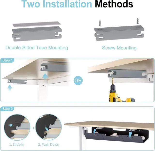 NO-DRILL INSTALLATION Mount easily with strong double-sided adhesive no tools or drilling required. Designed for secure mounting under most wood desktops without damage. Screws are also included for optional permanent installation