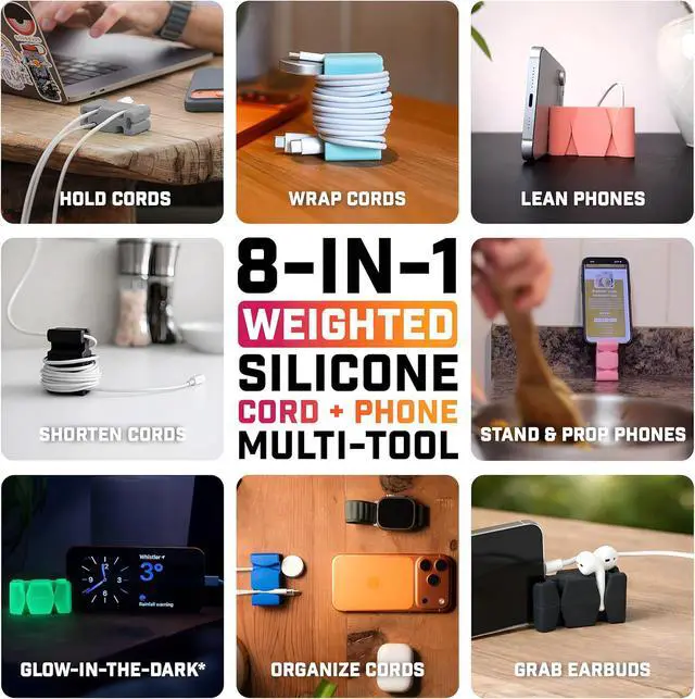 NEVER DROP CORDS: Keep cords secure with our weighted cord holder, designed for cable management on your nightstand cord holder setup, desk, or counter. A steel core adds heft, while grippy silicone makes for a cord clip to ensure cords stay put, making it a must-have desk accessory.