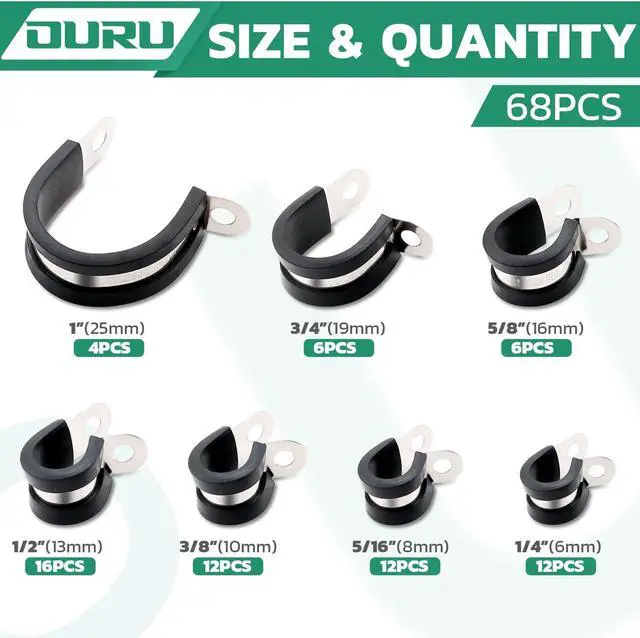 68PCS Cable Clamps Assortment Kit The stainless steel cable clamps assorted box including 7 different sizes, 12pcs 1/4 (6mm), 12pcs 5/16 (8mm), 16pcs 1/2 (13mm), 12pcs 3/8 (10mm), 6pcs 3/4 (19mm), 4pcs 1 (25mm), 6pcs 5/8 (16mm), various sizes are available to meet your needs