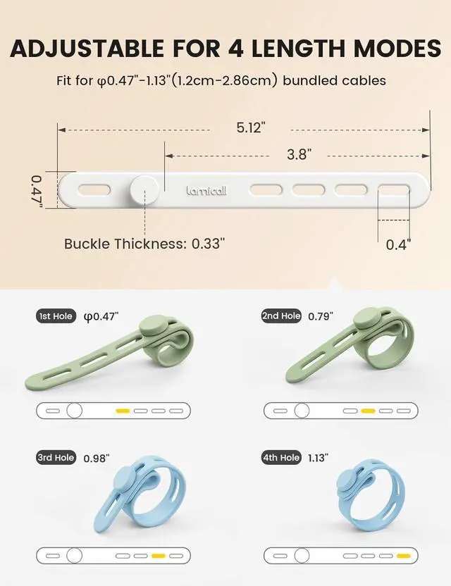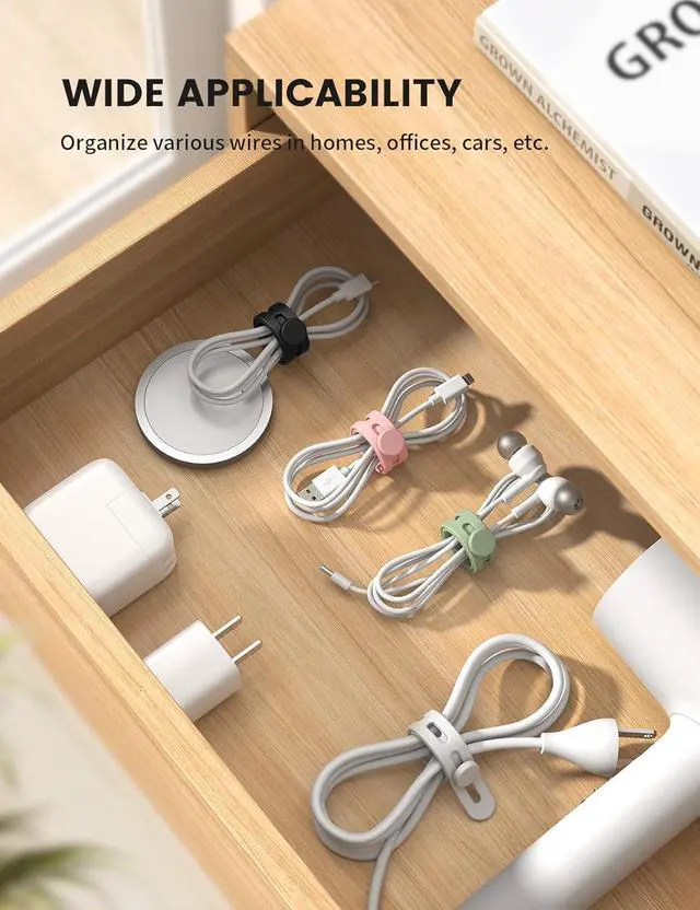 Cables Range: 0.47 " - 1.13 ", With 4 adjustment holes, Our Cable Ties Wire Wraps are versatile and can accommodate various types of wires, from thin phone charging cables, headphone cords to thick eletrical computer power cords. These Cord Organizer Cable Ties are also perfect for use in the kitchen, home, office, car, travel, etc. You can use the cable ties for organizing the clothes hangers, bundling curtains, umbrellas, securing candy and bread bags, and more