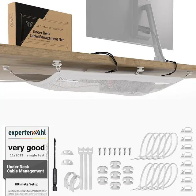 Finally a clean cable management under desk! Organize multiple plugs and wires effortlessly with the smart under desk cable net. Install your flexible cable management tray under desk for your gaming setup or home office.