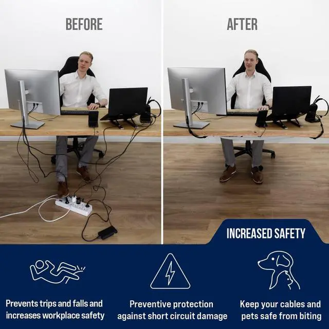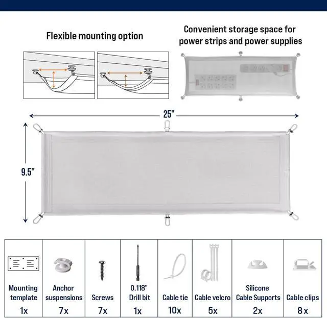 Hide every cable! A flexible cable net under desk offers enough space to store all power supplies and plugs. Position the under desk cable management tray to sort all cables clips included and keep your cable tidy desk neat.