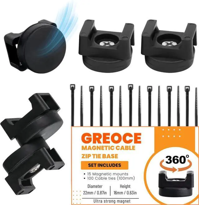 PACKAGE CONTAIN: 15 pieces of magnetic zip tie mounts, 100 zip ties 100mm, maximum vertical pull of approx 8.5 pounds. Equipped with industrial-grade magnets, this magnetic cable organizer keeps your cables secure on metal surfaces, perfect for garages, offices, and workspaces.
