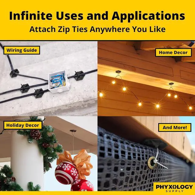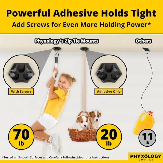 ENGINEERED FROM SCRATCH FOR MAXIMUM STRENGTH. Our extra large 1.5 inch ziptie mounting bases can hold 20-77 lbs depending on the surface if you use screws. These are not cheap, lightweight adhesive squares - these are built to work for life.