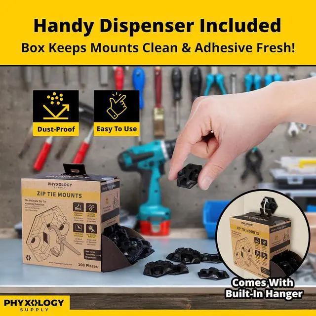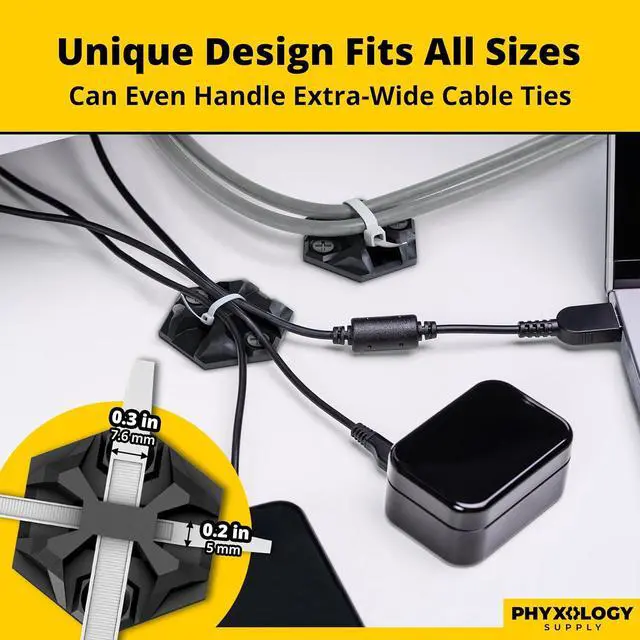 WORKS WITH JUMBO & MICRO CABLE TIES. Fasten and bind anything (heavy or light, small or big) with any size extension cable or twist ties and attach to most surfaces with our adhesive-backed and attachment-ready industrial mountable cable keepers.