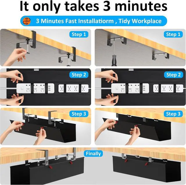 Easy Installation: Our under-desk cable tray features two installation methods, with optional clip-on or screw-mounted brackets. The process is effortless and convenient, requiring no drilling. Simply clamp or tighten easily to quickly complete the installation of the computer cable organizer.