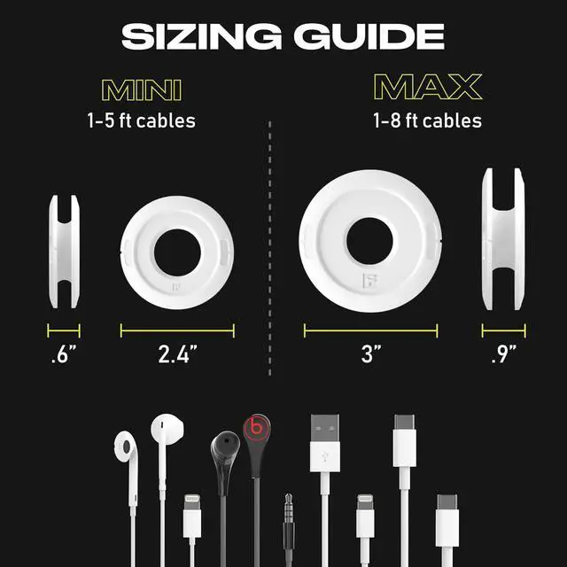 Tailor Your Tether: Adjustable Mini fits 1-5 ft cables, and the Max fits 1-8 ft cables, making it ideal for earbuds and cables alike.