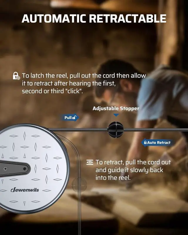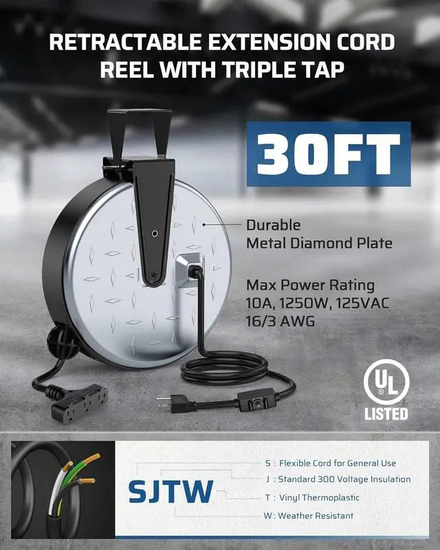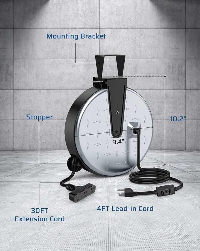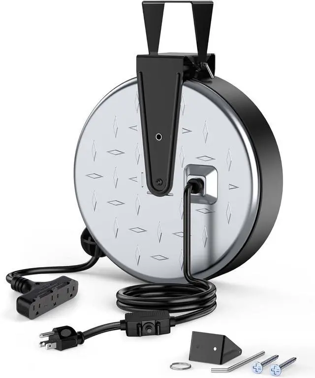 [Automatic Retractable] The auto-guide rewind mechanism of this retractable power cord reel ensures the cord retracts smoothly without any annoying kinks or tangles; the ratcheting system allows you to lock the cord at any length, making it a breeze to quickly store away once you' re finished